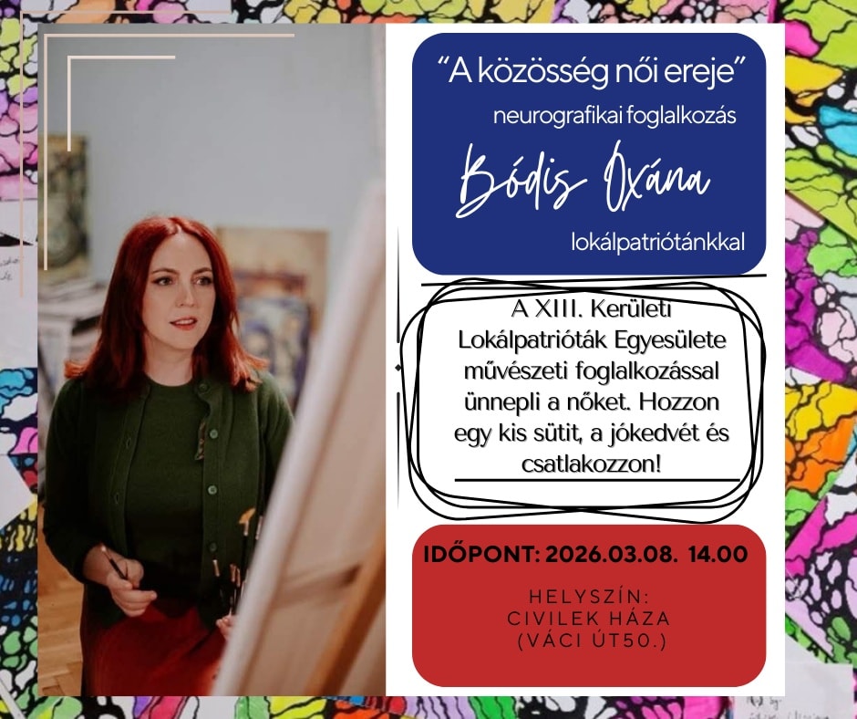 A XIII. Kerületi Lokálpatrióták Egyesülete idén különleges nőnapi eseménnyel készül: most Önök kerülnek a középpontba. A program fókuszában a neurografika áll – egy kreatív, önismereti módszer, amely segíthet a lelki …