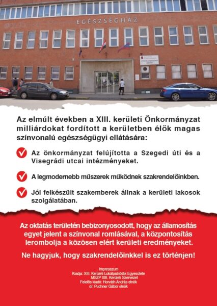 Az önkormányzat már többször nyilatkozott arról, hogy a szakrendelőket saját hatáskörben működteti. Előszőr a kilencvenes években, majd 2013-ban is. Így tehát az önkormányzat álláspontja borítékolható. De most nekünk, XIII. kerületieknek, lokálpatriótáknak is meg kell mutatnunk, hogy mit szeretnénk. Azt akarjuk, hogy maradjon helyben a felelősség.