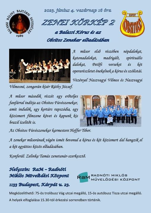 Zenei Körkép 2 2023.06.02.2023.06.22. a bejegyzés dátuma Devanszki Kata írta Kedves kerületi lokálpatrióták, kerületi lakosok. Barátaink, és együttműködő civil szervezet, a Balassi Bálint Bajtársi Egyesület Kórusa és az Obsitos Fúvószenekar ismét fellép a RaM-ban. Gyertek minél többen, nagy élmenyben lesz részetek!