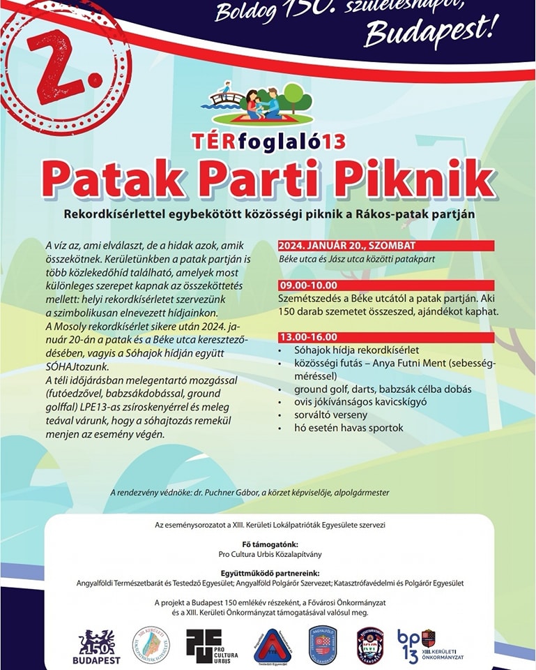 Tavaly nyáron, amikor megálmodtuk a Térfoglaló13, avagy a Patak Parti Piknik rendezvénysorozatunkat, az adta a verézfonalat, hogy minél több szomszédunkkal minél jobban érezzük magunkat, miközben a Rákos-patak adta lehetőségeket élvezzük, mindezt pedig közös lakóhelyünk, Budapest 150. évfordulójának égisze alatt tegyük. A Pro Cultura Urbis Közalapítvány, amely a Fővárosi Önkormányzat intézménye által kiírt pályázatunk informálisan elnyerte a legkretívabb, legkiemelkedőbb anyag „díját”, de díj helyett nekünk az elismerő szavak is nagyon jól estek. Ennek dicsfényében vágtunk bele a megvalósításba.
