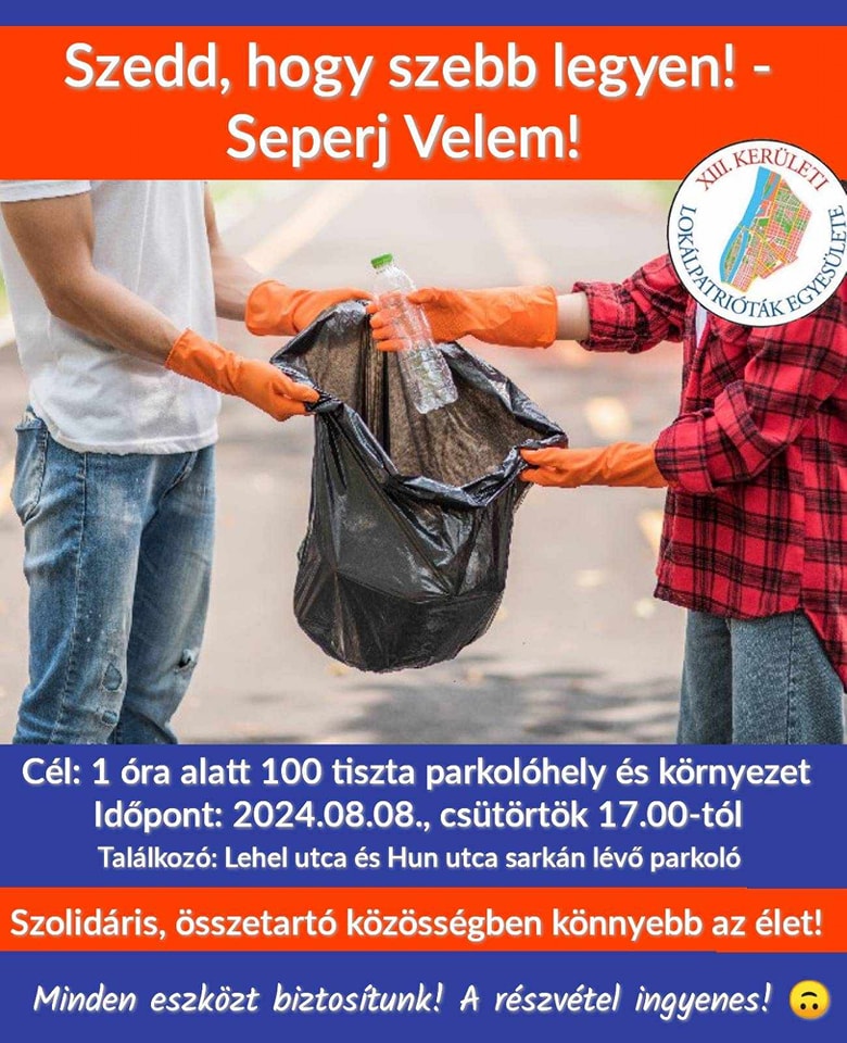 Augusztus 8-án, csütörtökön 17.00-tól ismét összegyűlünk és rárontunk a szemetes parkolóhelyekre. Cél, hogy legalább 100 parkolóhelyet és környezetét szeméttelenítsük.Csatlakozz és Szedd, hogy szebb legyen, vagyis Seperj velem! Találkozzunk a Lehel …