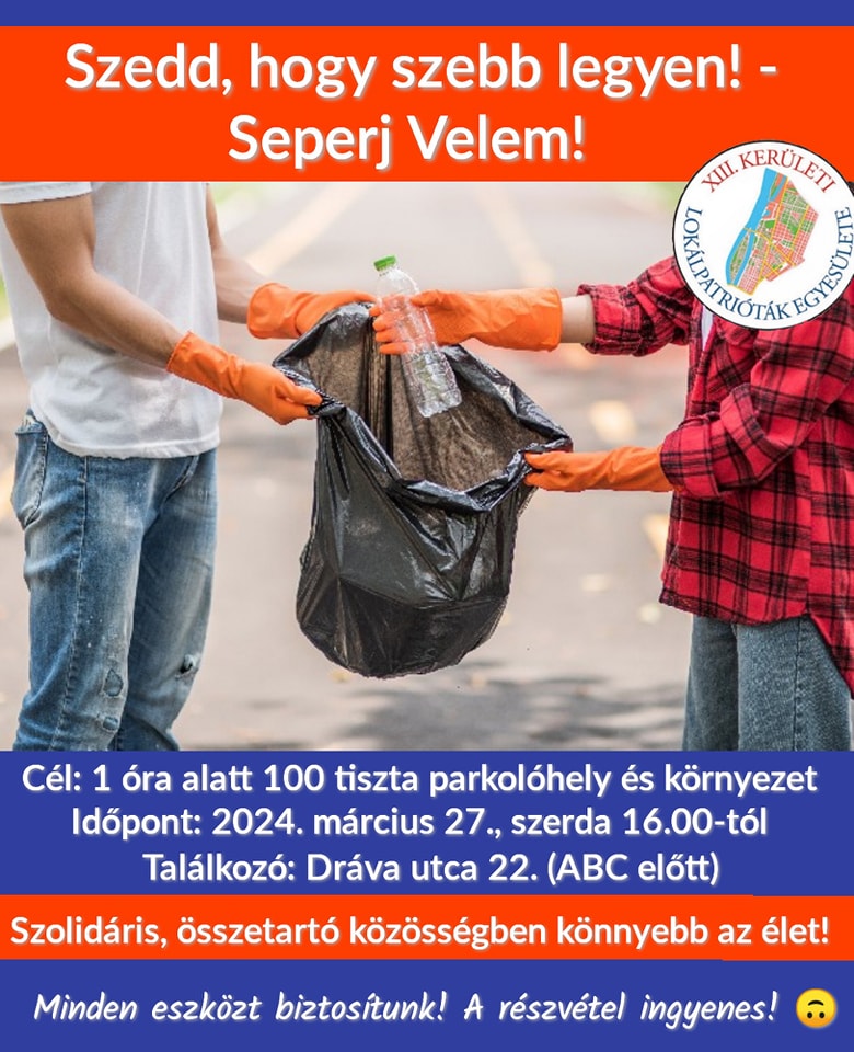 Itt a tavasz, ezért újra utcára megyünk, hogy kerületünk tisztaságáért mi, lokálpatrióták is tegyünk. Csatlakozzon hozzánk! Találkozó: ma, szerdán 16.00 órakor a Dráva utcai élelmiszerüzlet előtt (Dráva utca 22.) Kesztyűt …