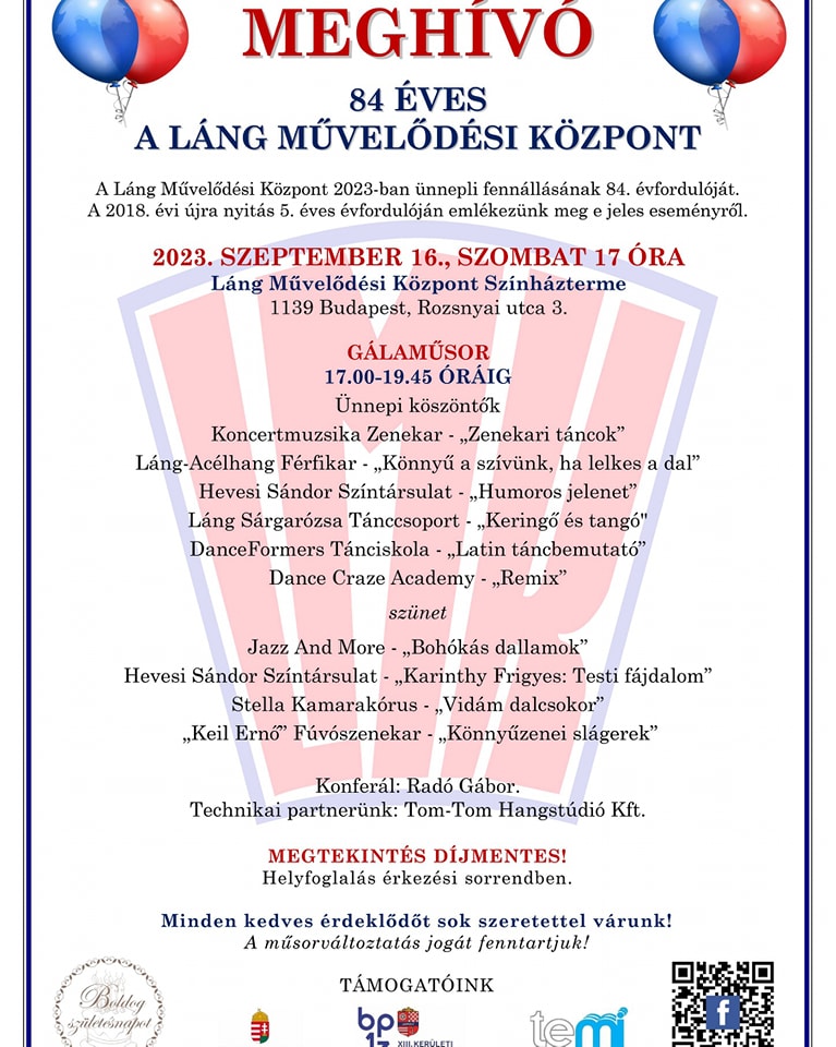 A Láng Művelődési Központ 2023-ban ünnepli fennállásának 84. évfordulóját. A felújítást követő 2018. évi újranyitás 5. éves évfordulóján ígéretes műsorral emlékeznek meg e jeles eseményről.A rendezvény helyszíne: Láng Művelődési Központ …