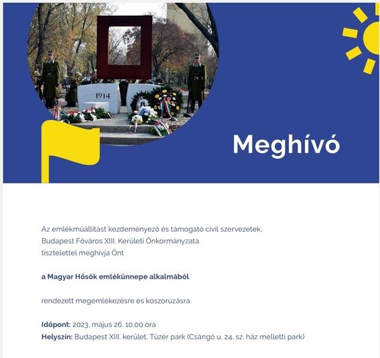 A magyar hősök emlékünnepét minden év május utolsó vasárnapján tartják, azokra a magyar katonákra és civilekre emlékezve, akik életüket áldozták Magyarországért.   2023. május 26-án, pénteken 10 órakor koszorúzással egybekötött …